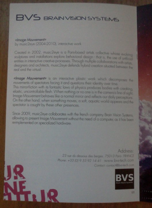 “Image Mouvement“, dans sa version électronique -réalisée en partenariat avec la société B.V.S. – sera présentée du 14 au 17 Octobre 2010 au Miraikan (Musée national des sciences émergentes et de l’innovation du Japon) à Tokyo. Dans le cadre du festival Futur en Seine on tour.