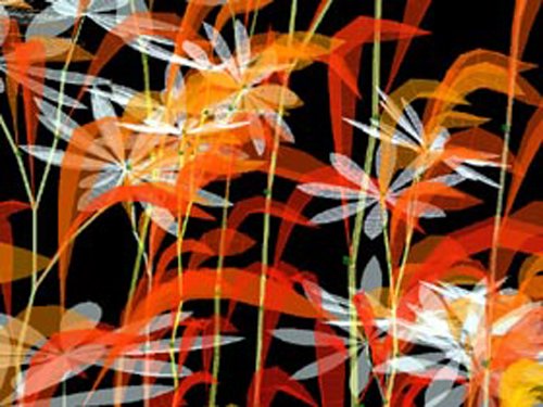 “Des graminées d’un rouge improbable, croissent sur l’écran lumineux et ondulent au gré d’un souffle alizéen. Leurs nervurations, visibles par transparence à chaque balancement de leurs feuilles, composent des architectures complexes. D’abord fragiles pousses, elles s’enhardissent et dressent leurs tiges vers un invisible ciel. Tant que rien ne vient contrarier leur expansion, elles prolifèrent et tendent à saturer tout l’espace. Ce qui les meut c’est cette volonté de puissance du vivant si bien analysée par Nietzsche. Ce vouloir vivre sans autre finalité que la perpétuation de lui-même.”…“Chaque plante a son programme morphogénétique, mais, dans sa sophistication, le calcul a prévu de l’aléatoire dans sa croissance. Et c’est en vain qu’on guetterait sa réapparition au lieu de son évanouissement. Elle repoussera, elle ou son clône, quelque part sur l’écran, en fonction du hasard ménagé dans sa programmation germinative. Peut-être au lieu où on l’a perdue. Plus probablement ailleurs. Mais elle repoussera. Car cette « autre nature » (1 ) ou cette sur-nature, est le contraire d’une nature morte. Elle est vivante. Elle est vivace. Elle est même prolifique. Et cette prolifération imprévisible, quoique savamment calculée, nous enchante parce qu’elle crée des effets de transparences et de surimpressions qui nous font rêver.”… Françoise Gaillard, philosophe.