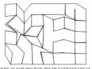 Ici je vous propose quelques expériences avec une variété nouvelle (à ma connaissance), que nous appellerons des dipoloids. Leur particularité? Ils sont composés de 2 pôles, à l’instar d’un dipôle, d’ou leur nom: dipole + boid = dipoloid! Ils sont régis par des forces supplémentaires, pour garder une cohésion (attraction entre les poles) et des forces d’attraction entre les pôles (par exemple, plus et moins peuvent s’attirer).