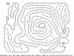 Les boids auront tendance à occuper l’espace disponible (le monde n’est pas toroïdal), mais selon l’intensité des forces mises en jeu, des organisations différentes apparaissent: