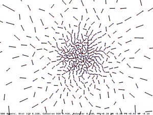 Vous connaissez sans doutes les boids,[1][2] ces petits agents au comportement simple, mais qui collectivement exhibent un comportement similaire à celui d’un banc de poisson, une nuée d’oiseau, etc. Cette vidéo de 1986 montre les premières simulations de Craig Reynolds: