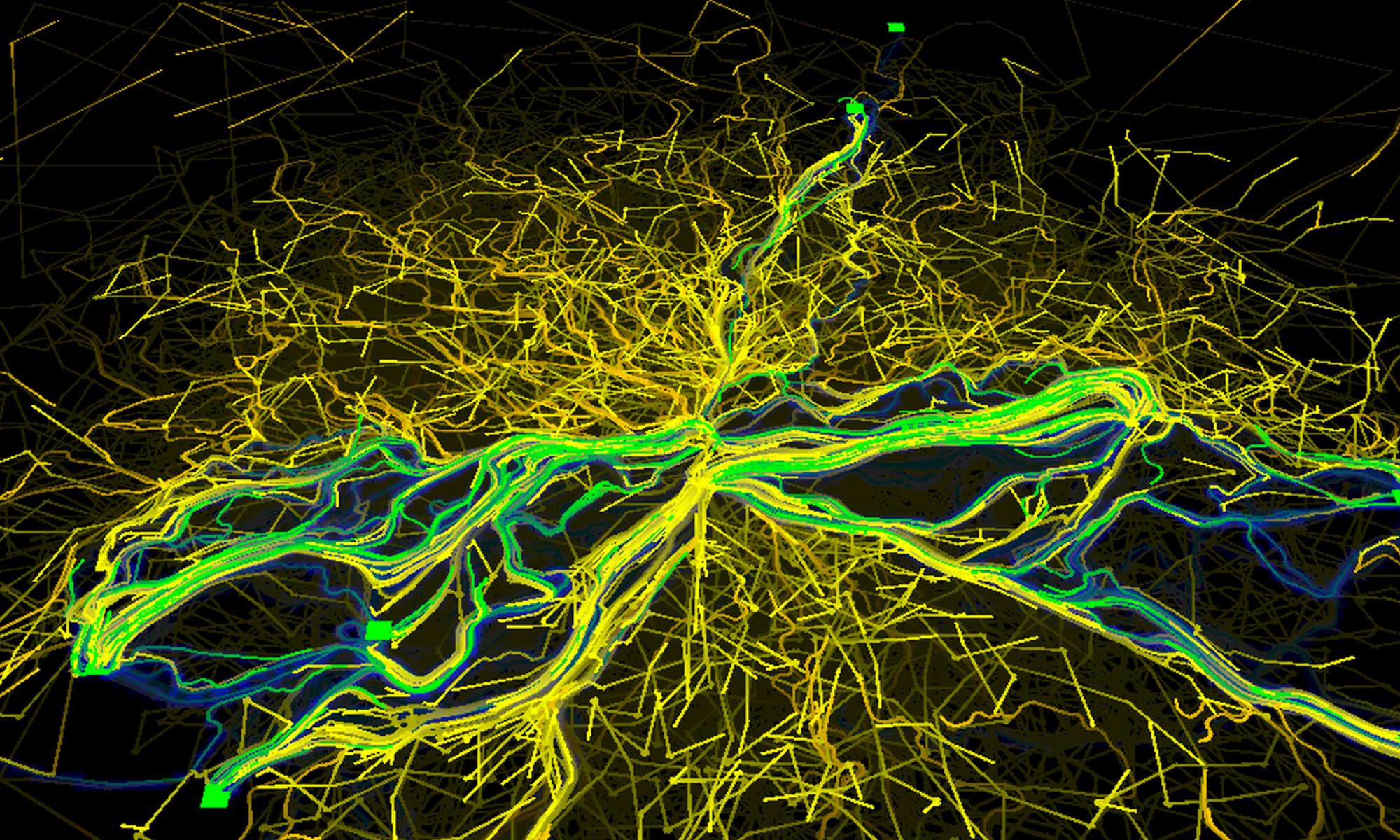 Le point de départ: une simulation d’insectes fourrageurs, tels des fourmis, partant à la recherche de nourriture. L’exploration est au début aléatoire, mais dès que l’une de ces créatures découvre des ressources, elle marque le chemin d’une phéromone, qui permettra a ses congénères de remonter la source. Apparaissent alors de premières routes éphémères…